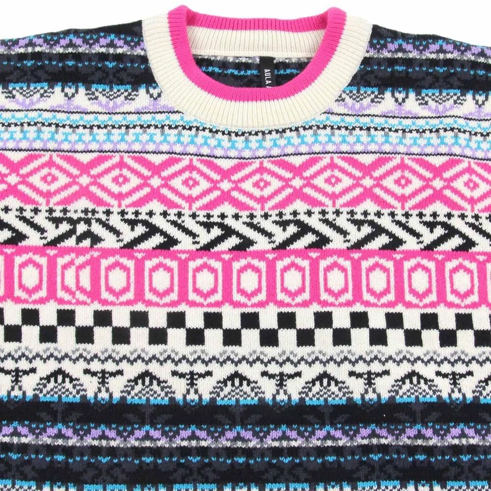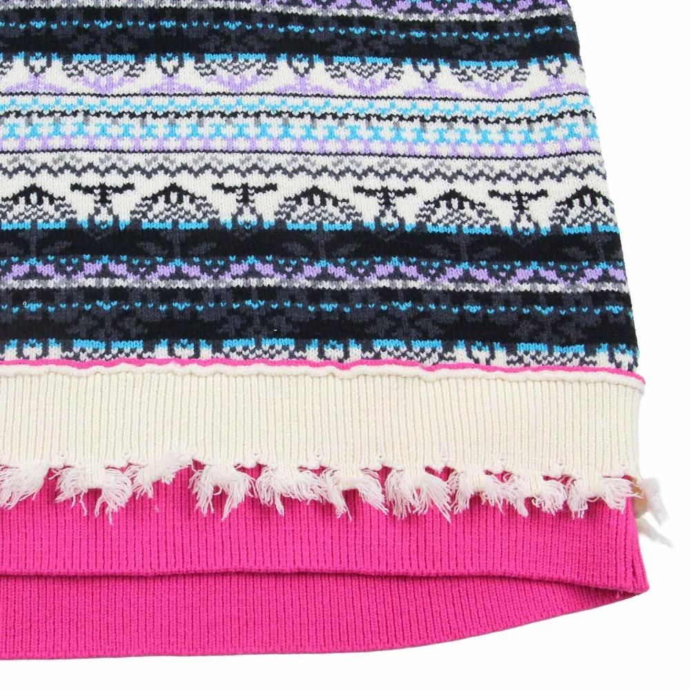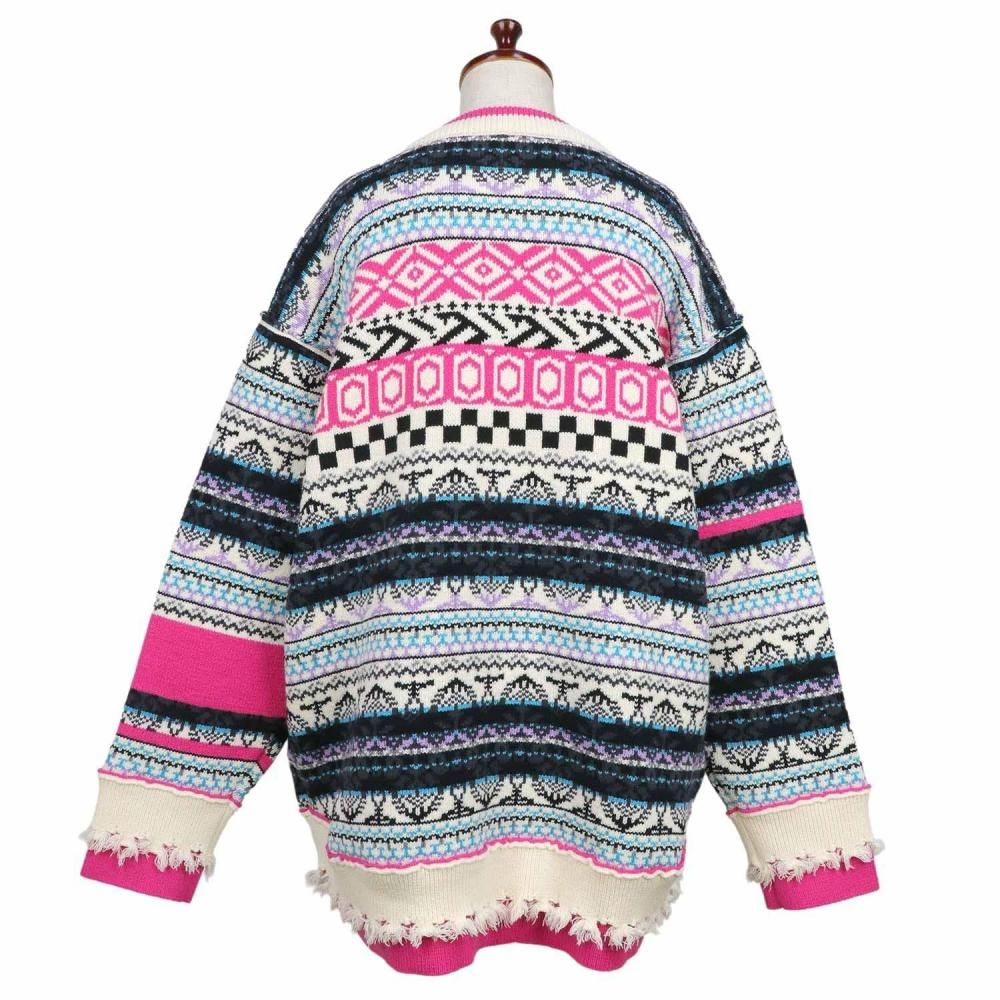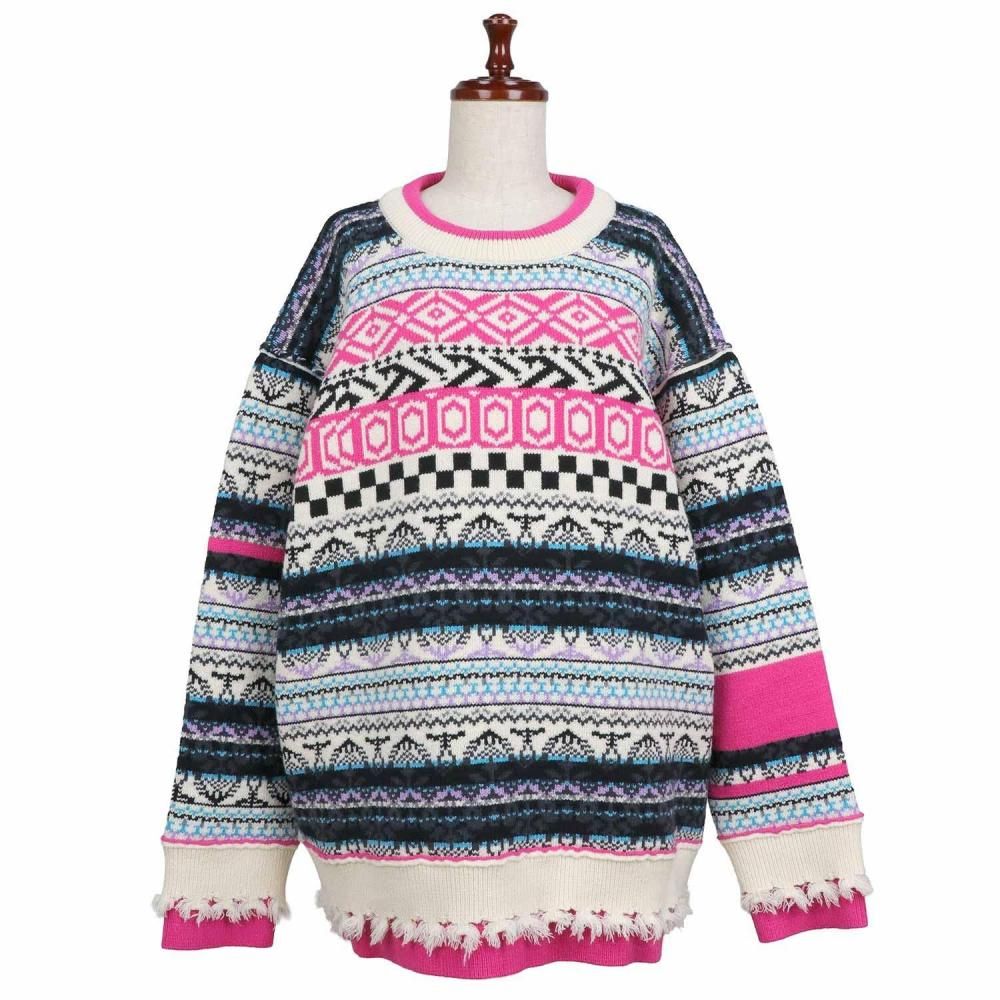 7配色の糸を使用した幾何学柄のジャガードプルオーバーで、