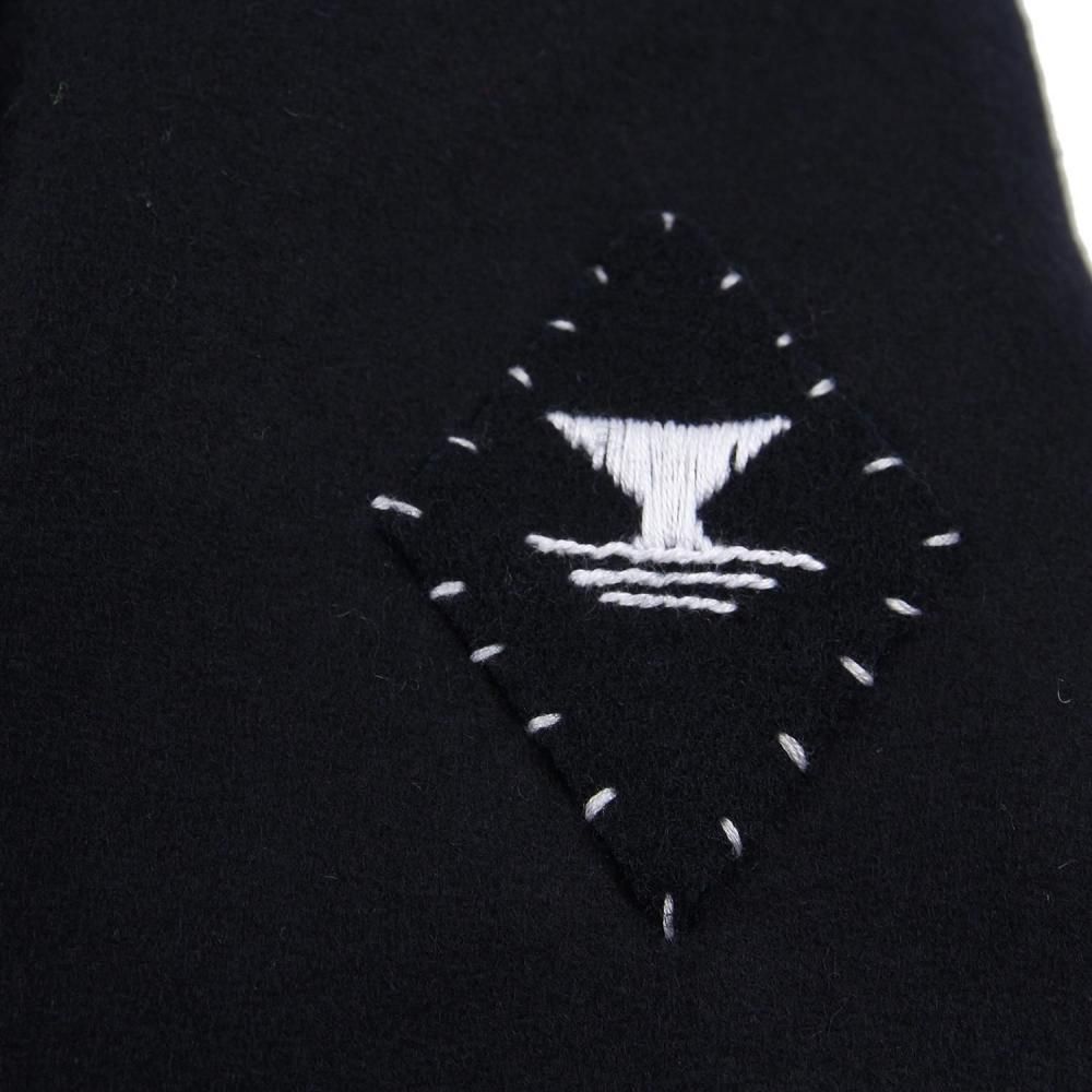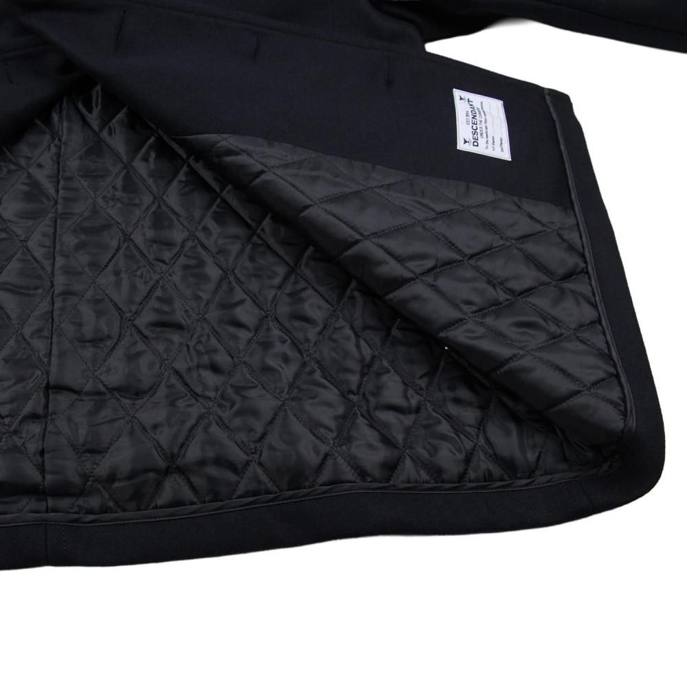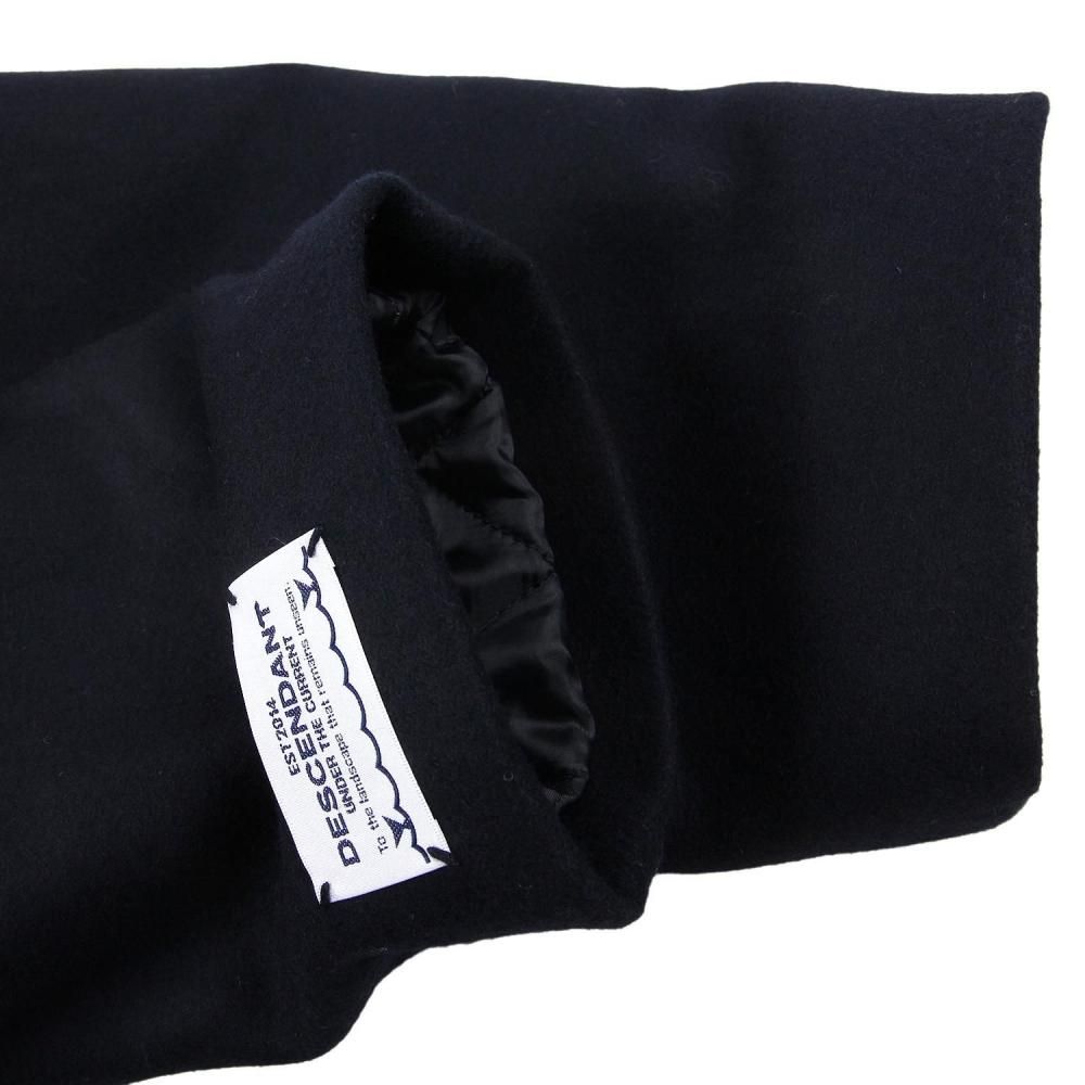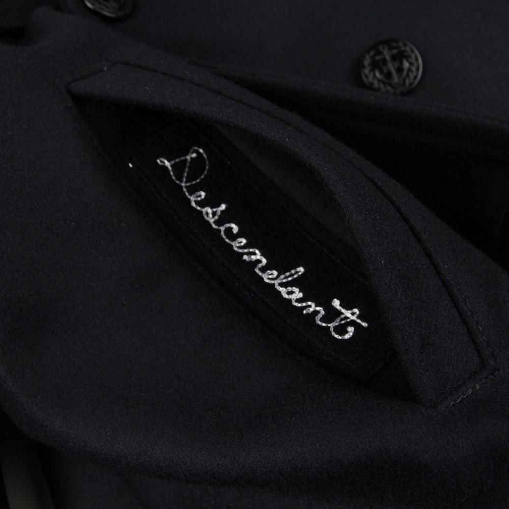 左袖に手刺繍による共地のFLUKE UPレーベル、身頃の右のハンドウォーマーポケットの内側にチェーンステッチ調のDescendantの刺繍。