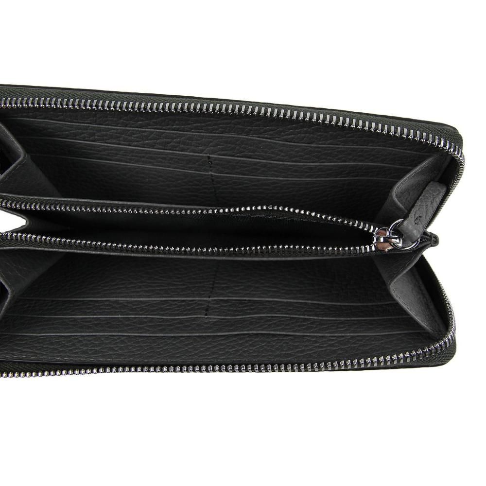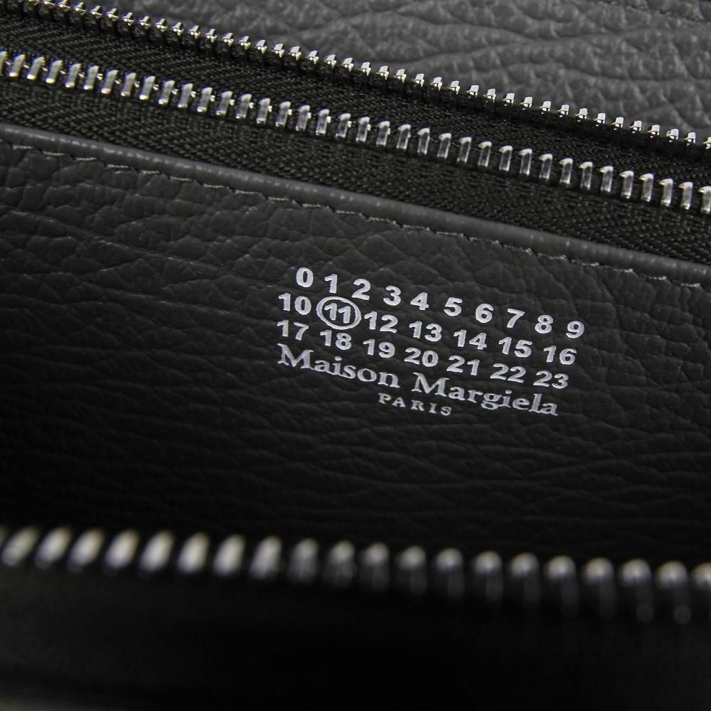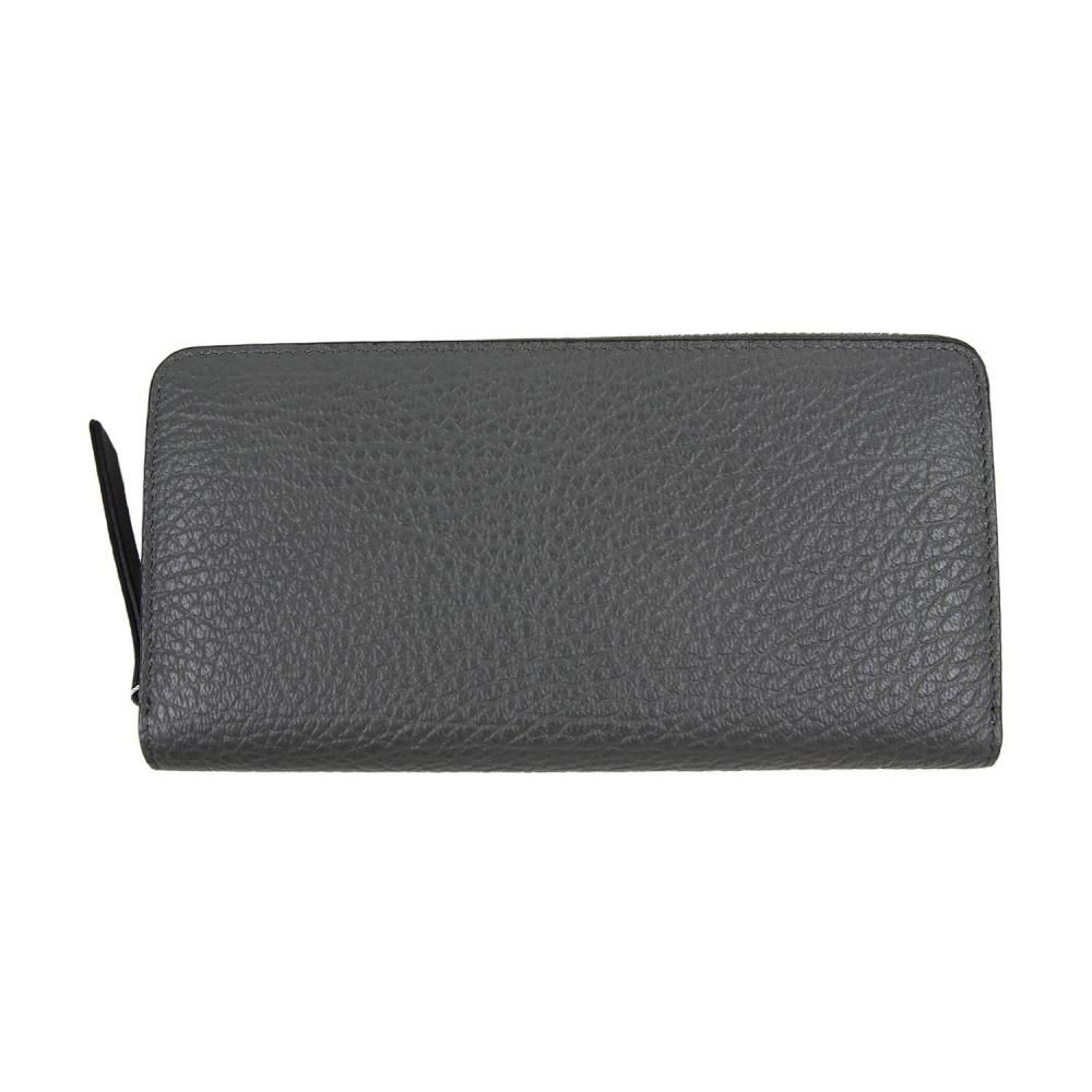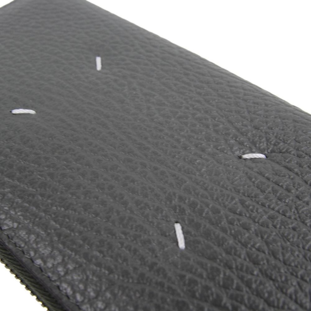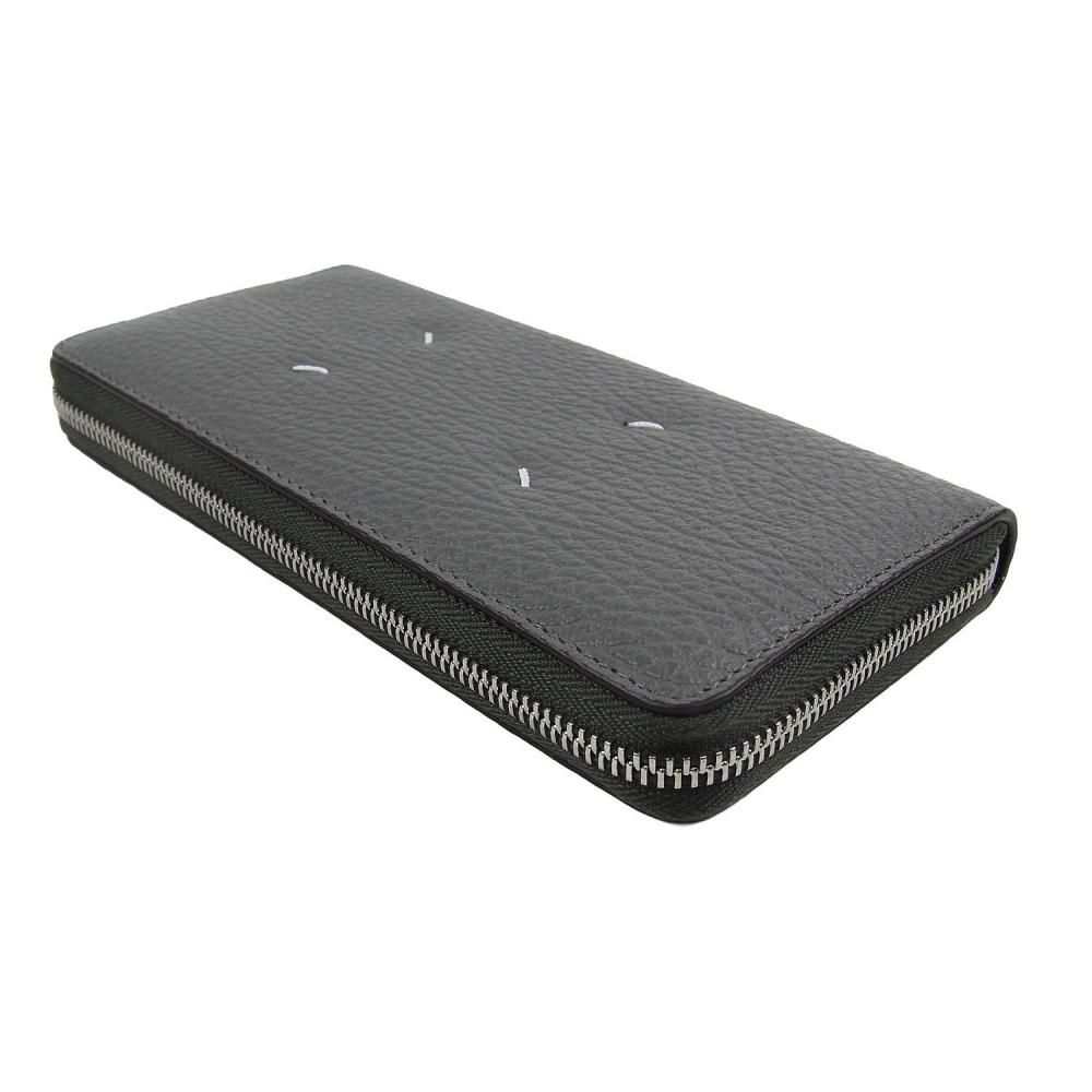 エンボス加工が施されたグレイニーレザー製のジップアラウンドウォレットです。内側にはファスナー付きの今ケースとカードホルダーが備わっており、ナンバリングロゴがあしらわれています。バックには、通常のファッションブランドのラベルとは対照的なメゾン マルジェラのシグネチャーの白い4ステッチがあしらわれています。