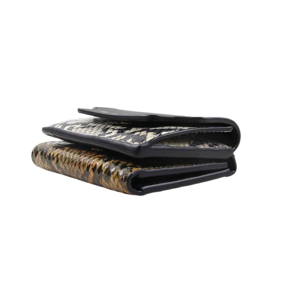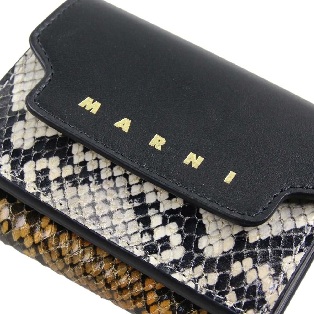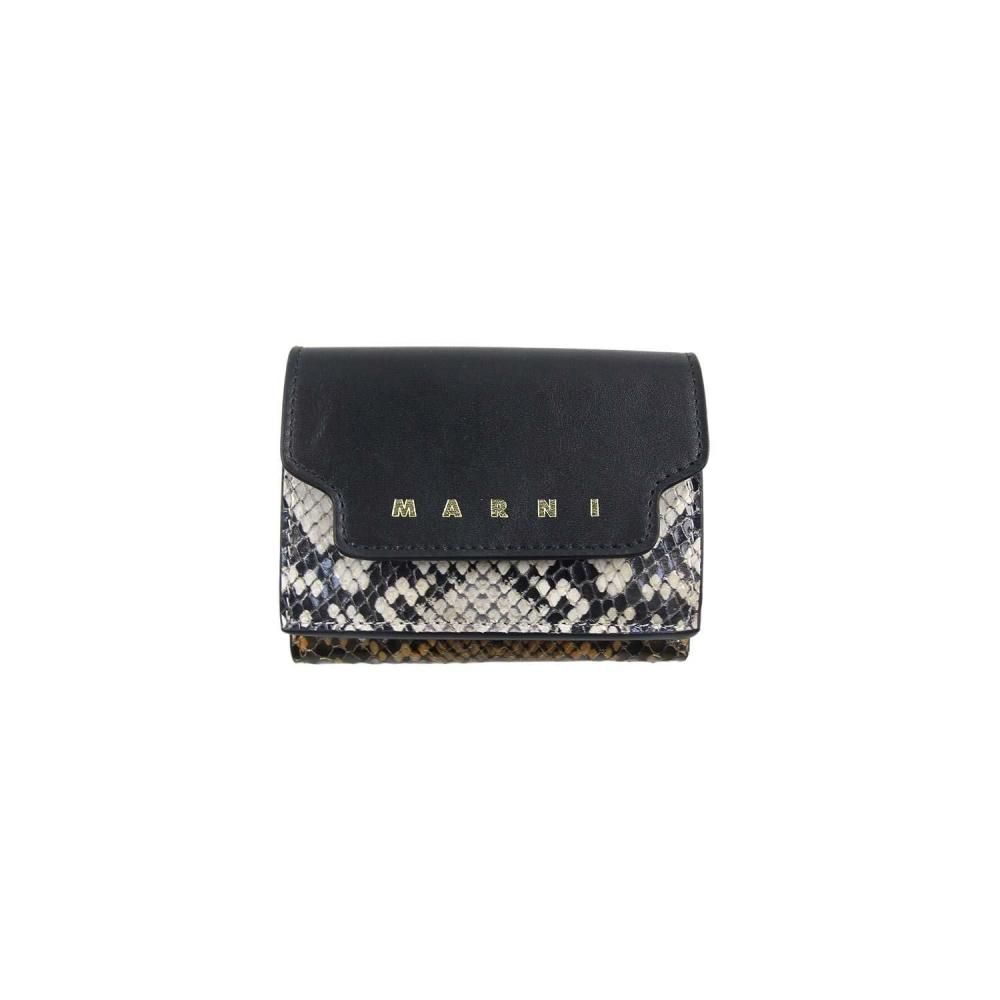 パイソンプリントのパネルをあしらったサフィアーノレザー製三つ折りウォレット。 スナップボタン留め。 外側にスナップボタン開閉式のコインポケット、フロントにゴールドプリントのマルニロゴ。 紙幣用コンパートメントとカードスロット6つ。