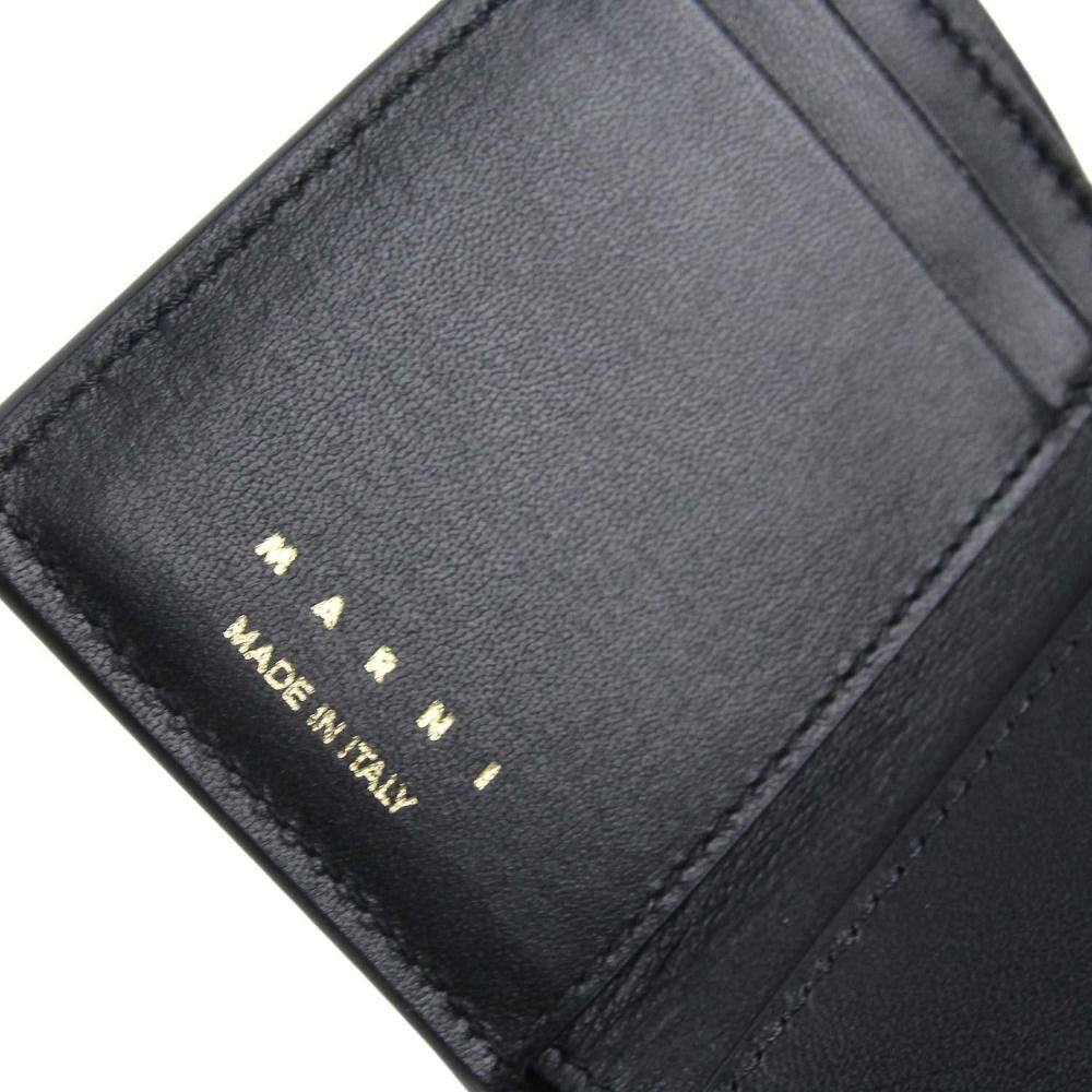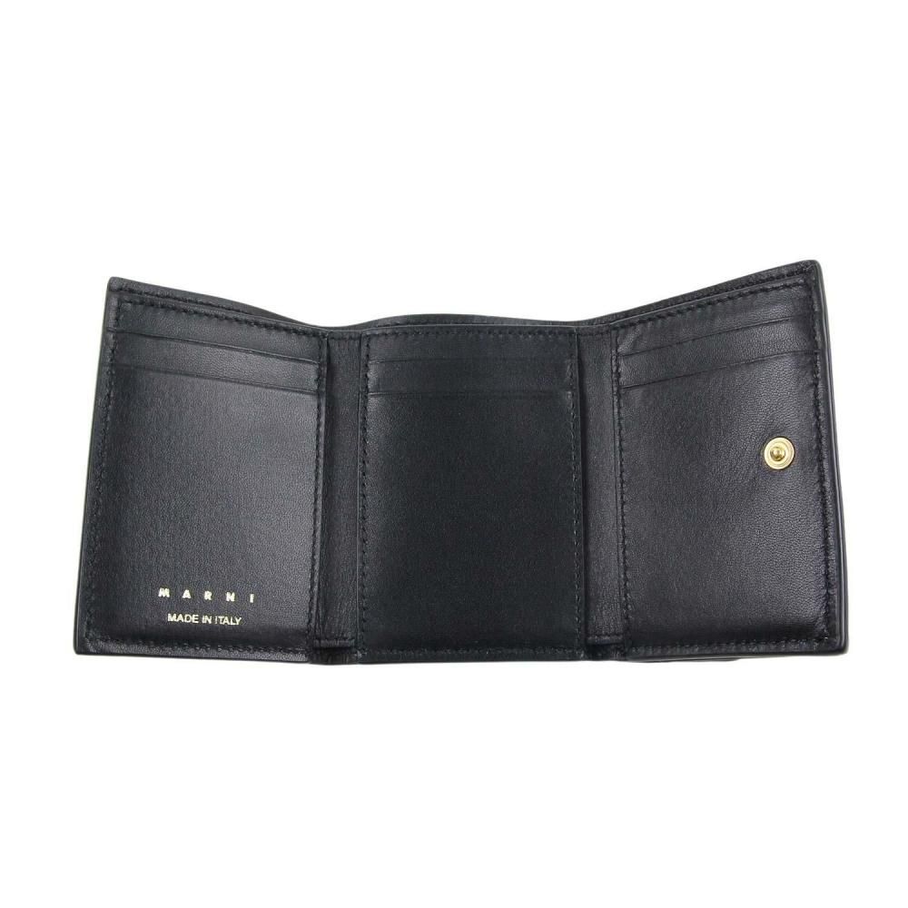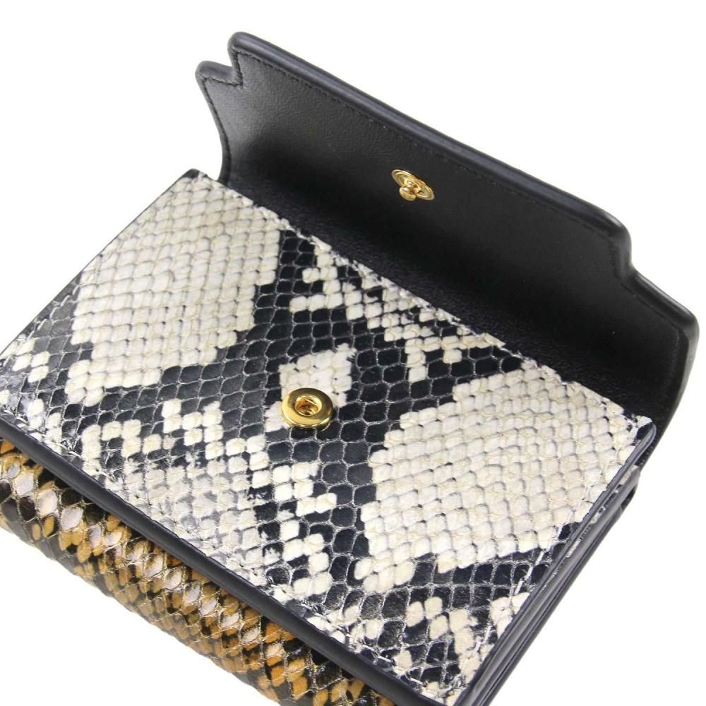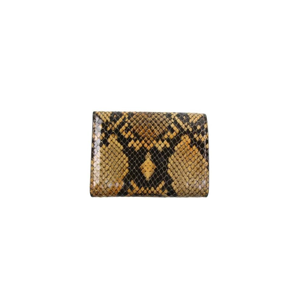 パイソンプリントのパネルをあしらったサフィアーノレザー製三つ折りウォレット。 スナップボタン留め。 外側にスナップボタン開閉式のコインポケット、フロントにゴールドプリントのマルニロゴ。 紙幣用コンパートメントとカードスロット6つ。