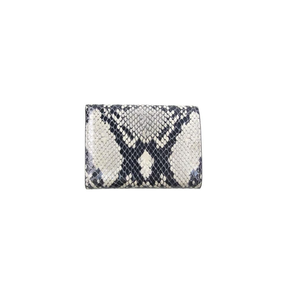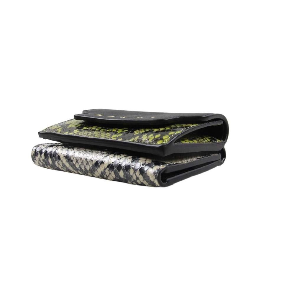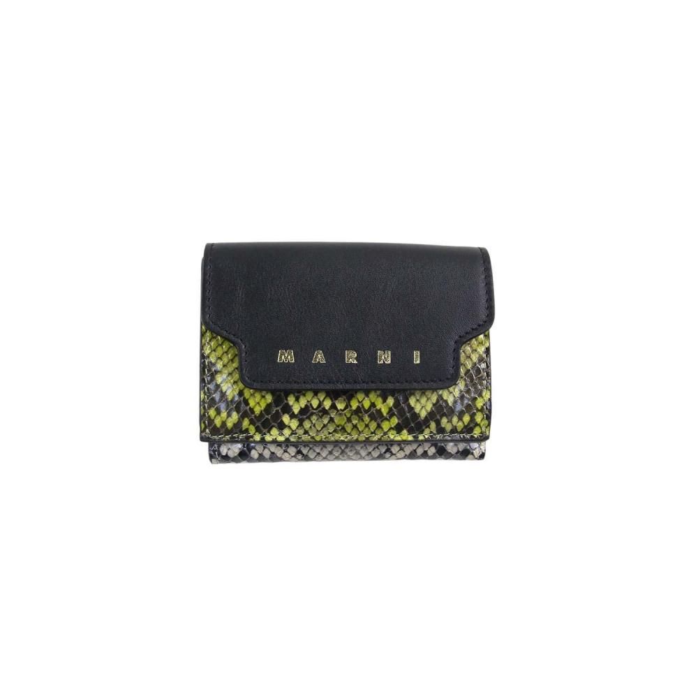 パイソンプリントのパネルをあしらったサフィアーノレザー製三つ折りウォレット。 スナップボタン留め。 外側にスナップボタン開閉式のコインポケット、フロントにゴールドプリントのマルニロゴ。 紙幣用コンパートメントとカードスロット6つ。