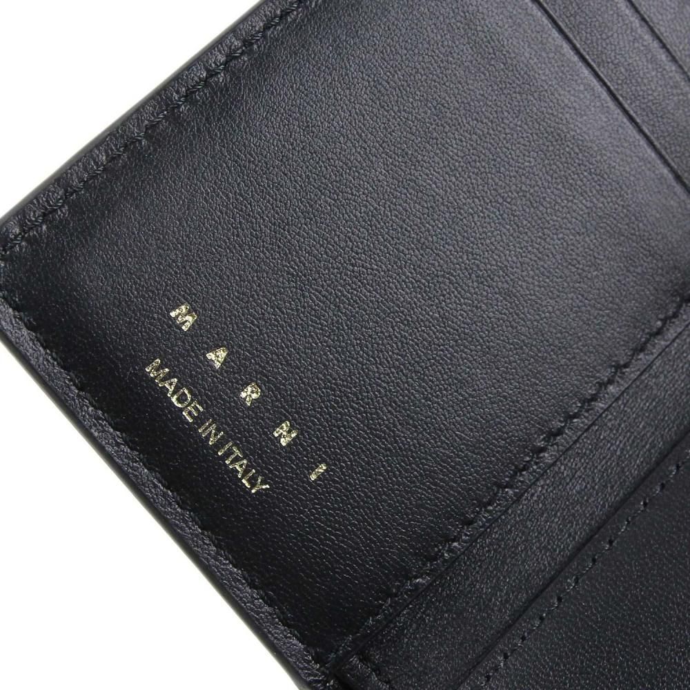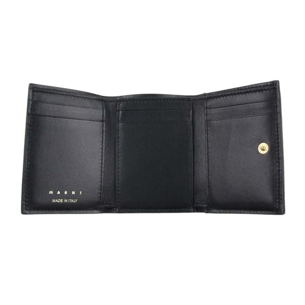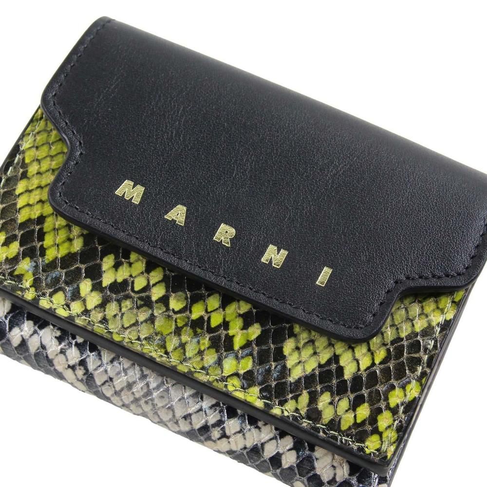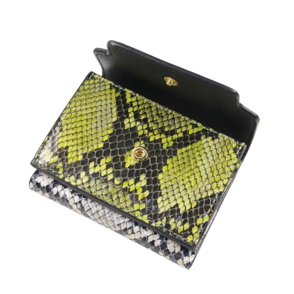 パイソンプリントのパネルをあしらったサフィアーノレザー製三つ折りウォレット。 スナップボタン留め。 外側にスナップボタン開閉式のコインポケット、フロントにゴールドプリントのマルニロゴ。 紙幣用コンパートメントとカードスロット6つ。