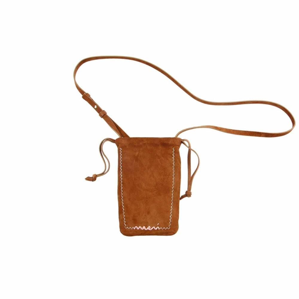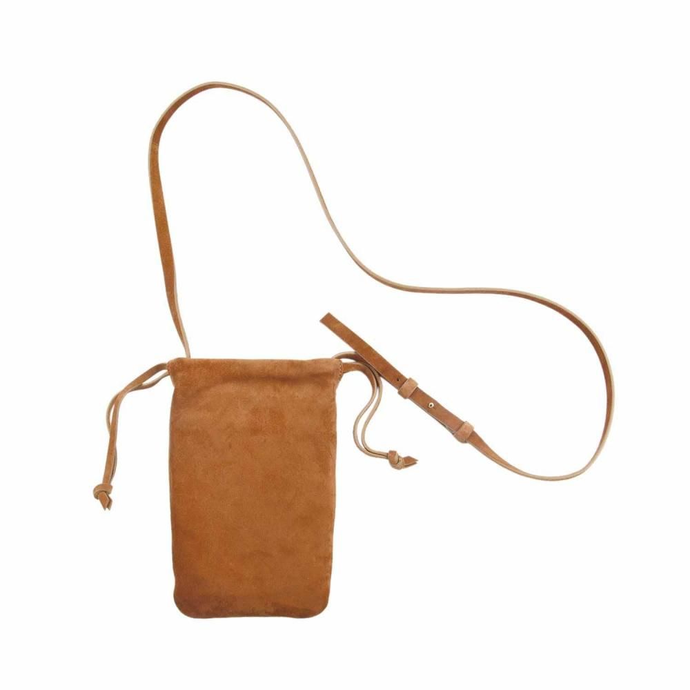 スウェード素材のスマホサイズポーチ。 調節可能なレザー製ドローコード。 スリムなショルダーストラップ。 コントラストカラー糸を使ったハンドステッチによるマルニメンディングロゴ。