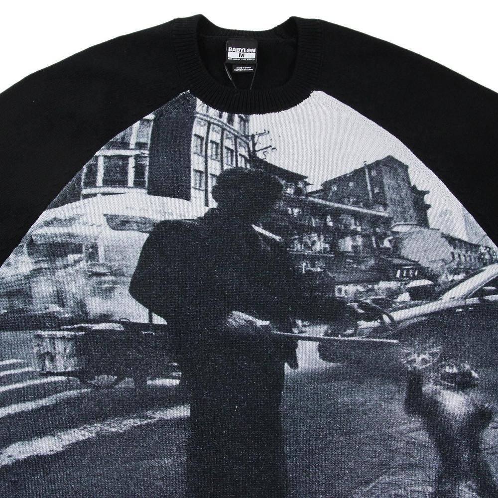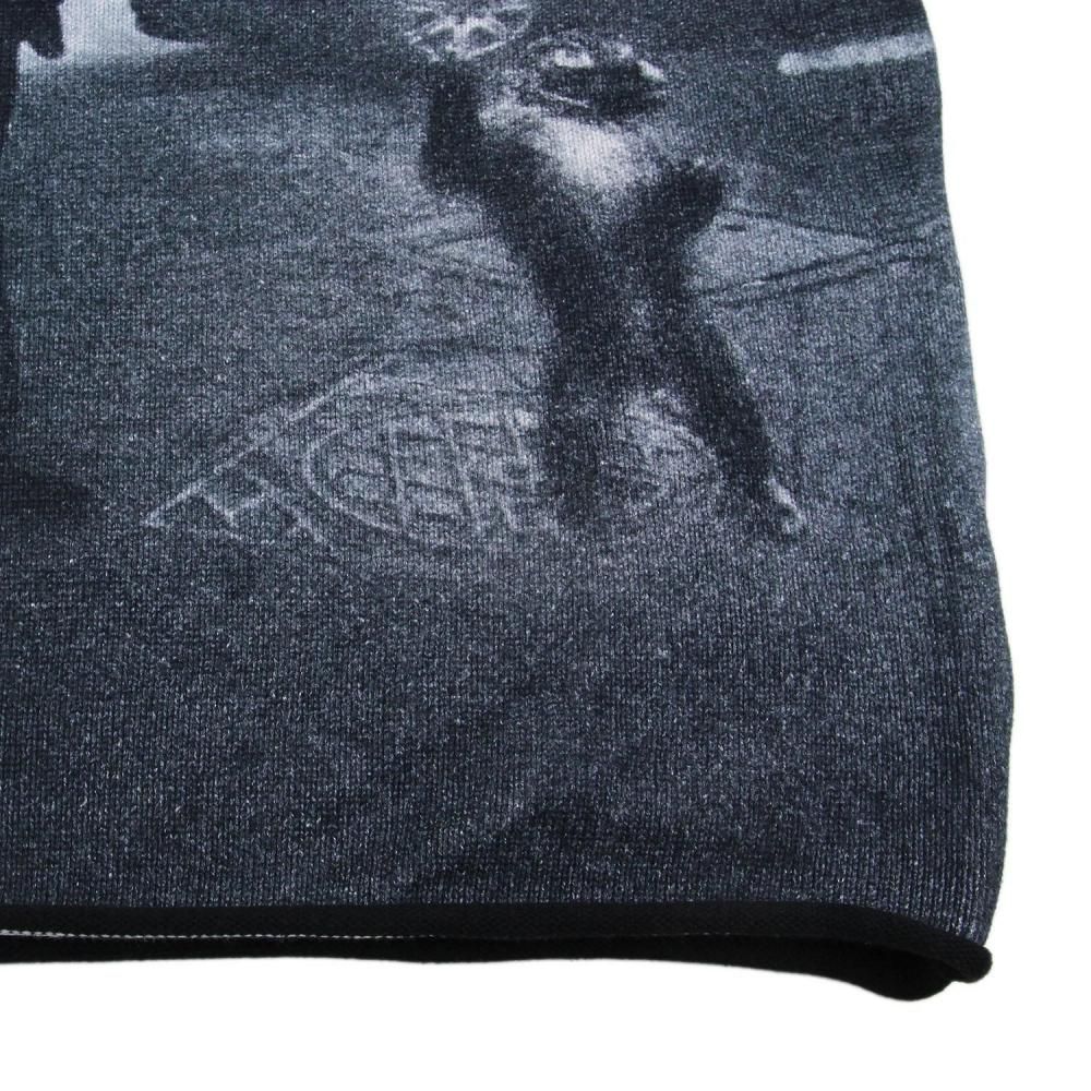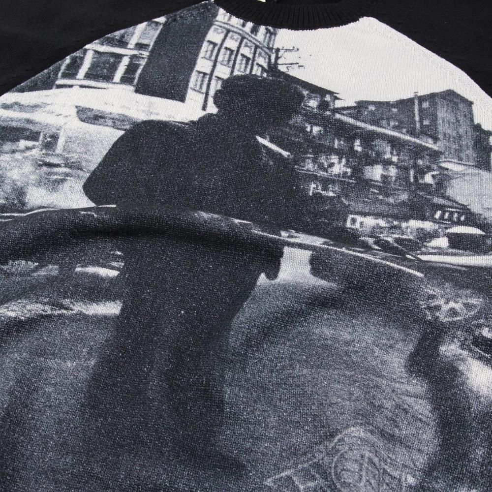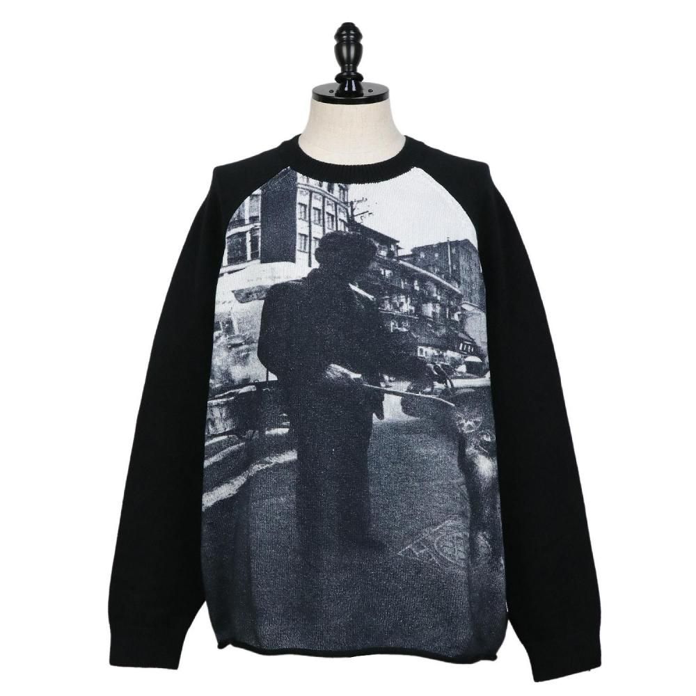 フロントのフォトグラフィックが目を引くコットンクルーネックニット