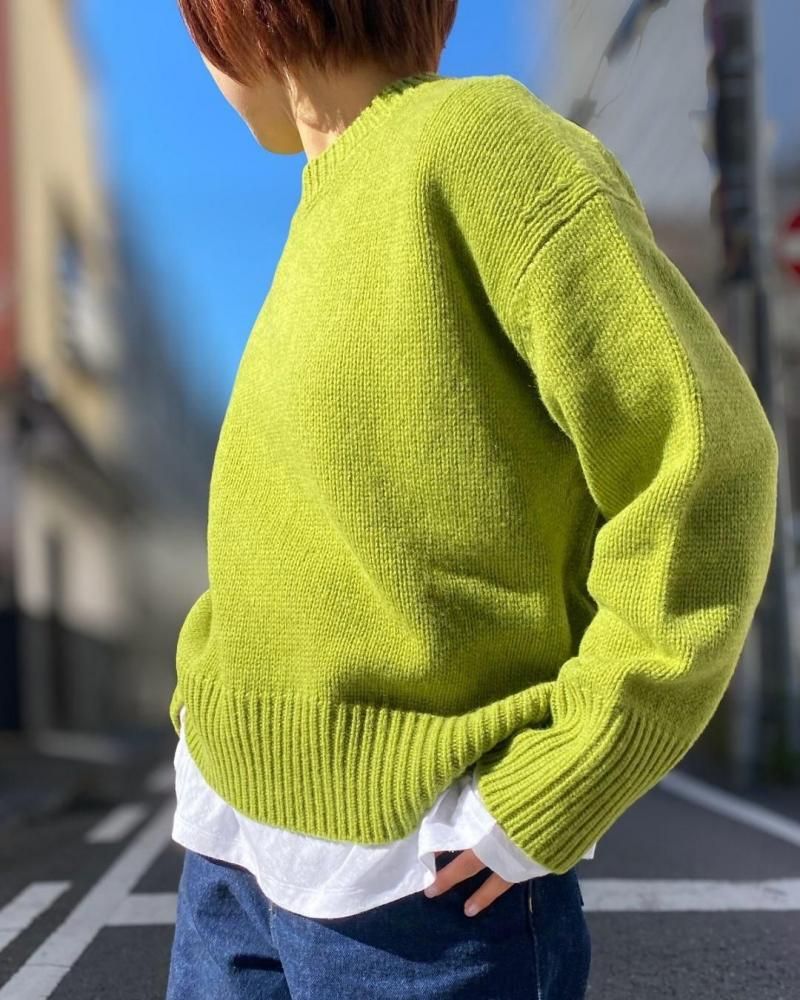 ゆったりとしたボディをベースに、太めの襟リブや編目の流れなどディテールにこだわりリラックスしたニュアンスのある表情に。
