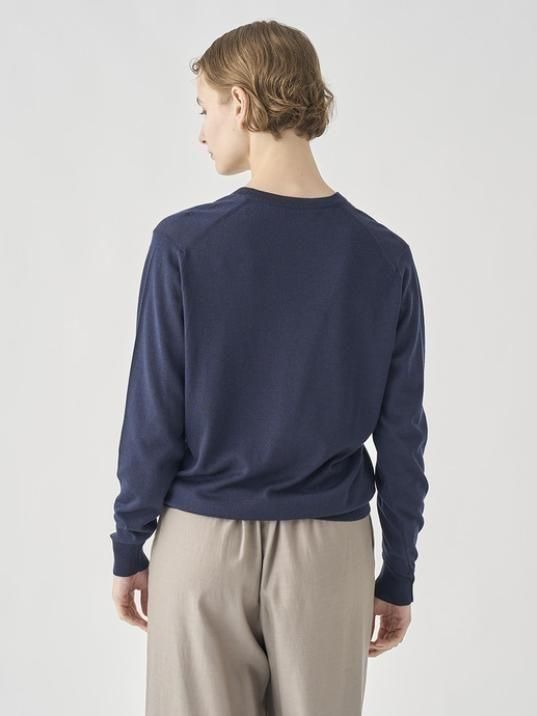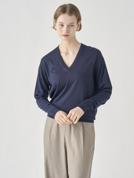 アウターを重ねてももたつかず、上質な薄手のハイゲージニットならではの質感がコーディネートを上品に格上げします。