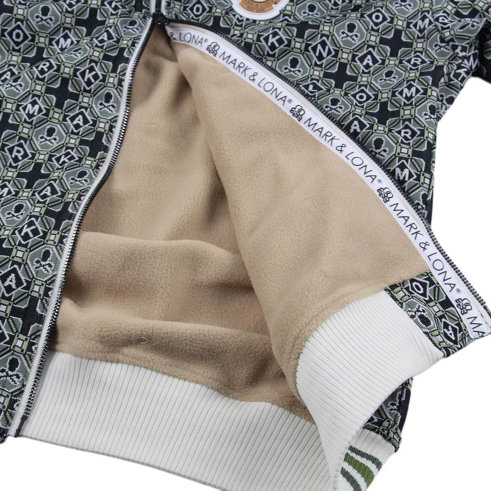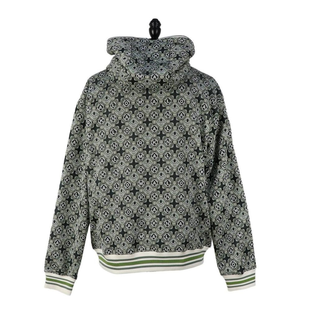 クロスとロゴをミックスしたジオメトリックパターンのフーデットジャケット。