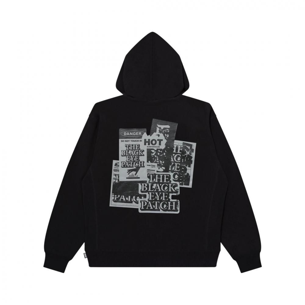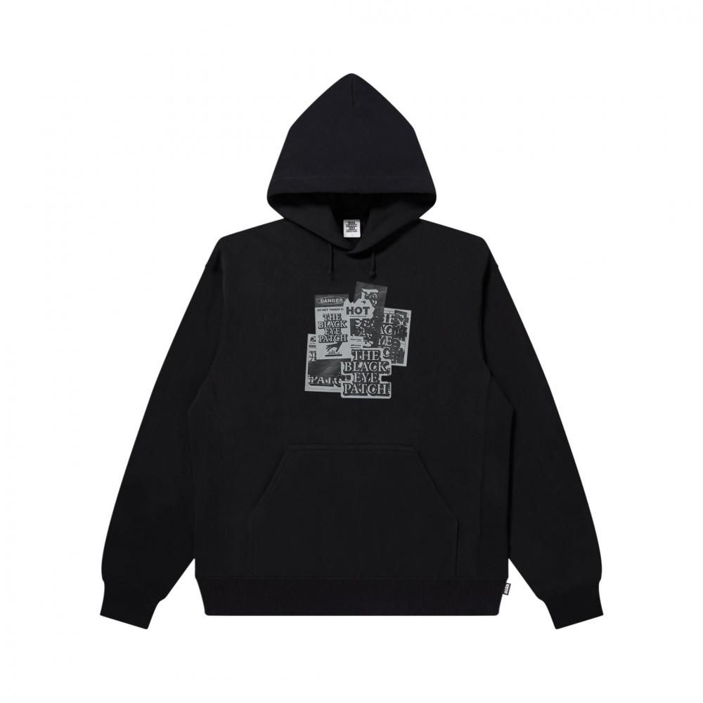BEP の代表的ラベルロゴシリーズが集結した "LABEL PACK" をボディと同系色のダークトーンで両面にプリントしたプルオーバーフーディ。
