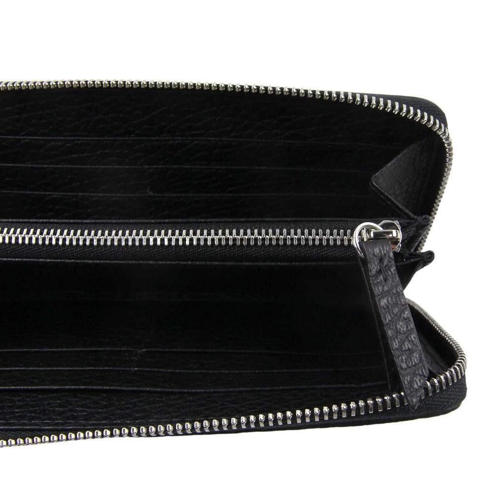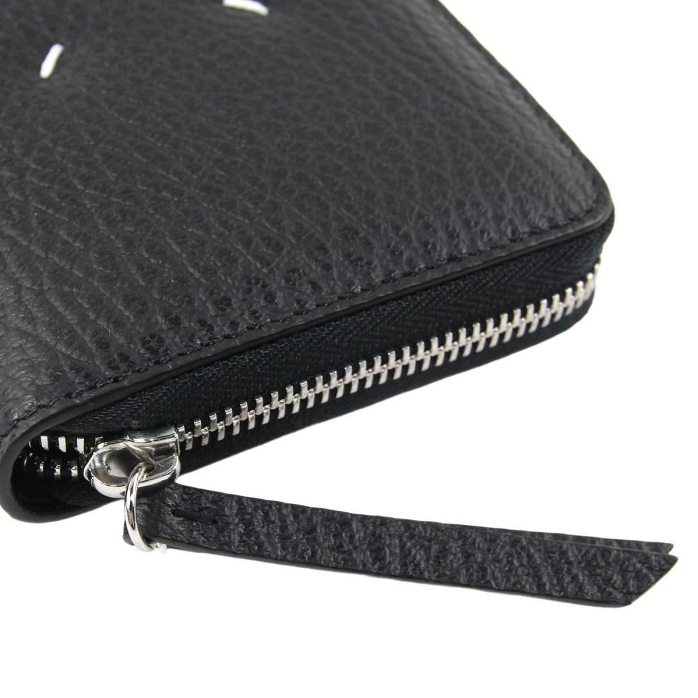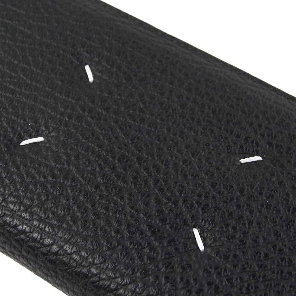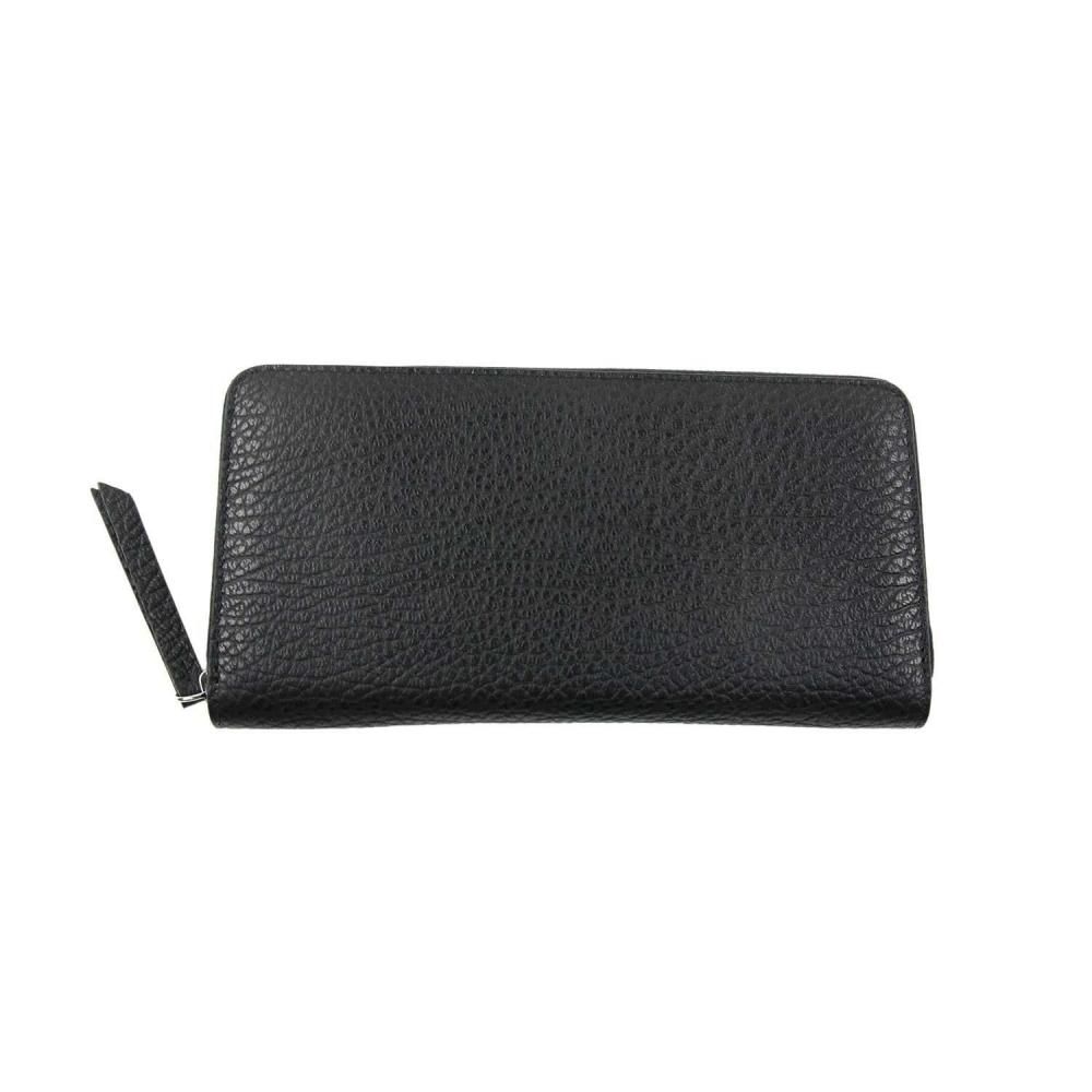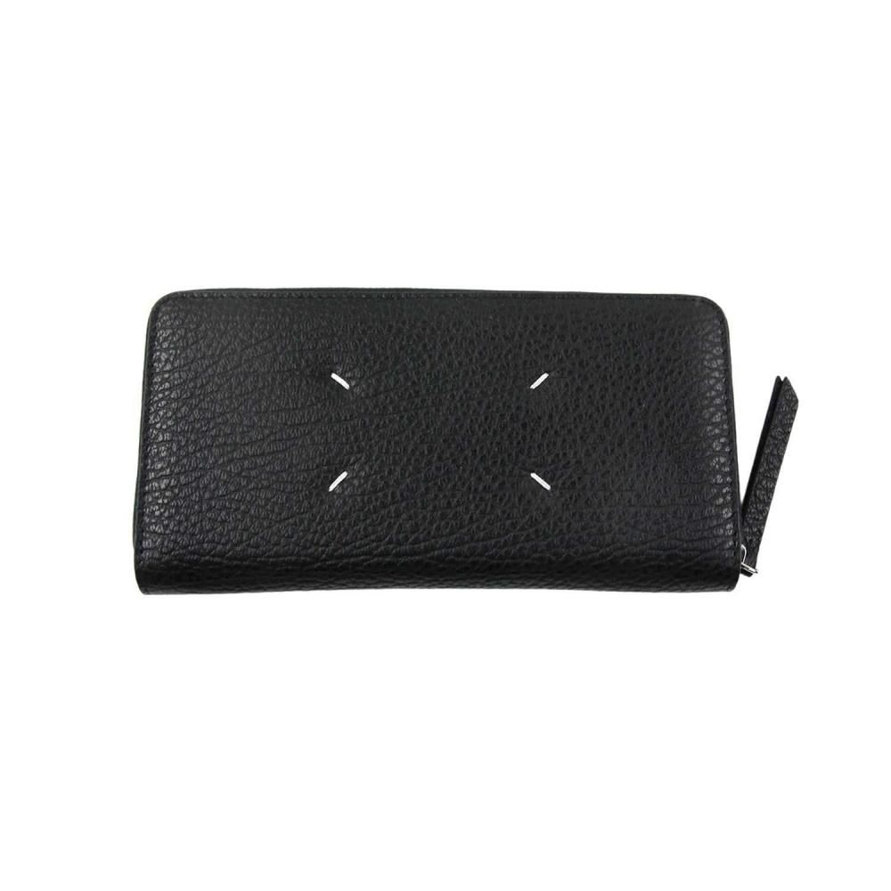 エンボス加工が施されたグレイニーレザー製のジップアラウンドウォレットです。内側にはファスナー付きの今ケースとカードホルダーが備わっており、ナンバリングロゴがあしらわれています。バックには、通常のファッションブランドのラベルとは対照的なメゾン マルジェラのシグネチャーの白い4ステッチがあしらわれています。