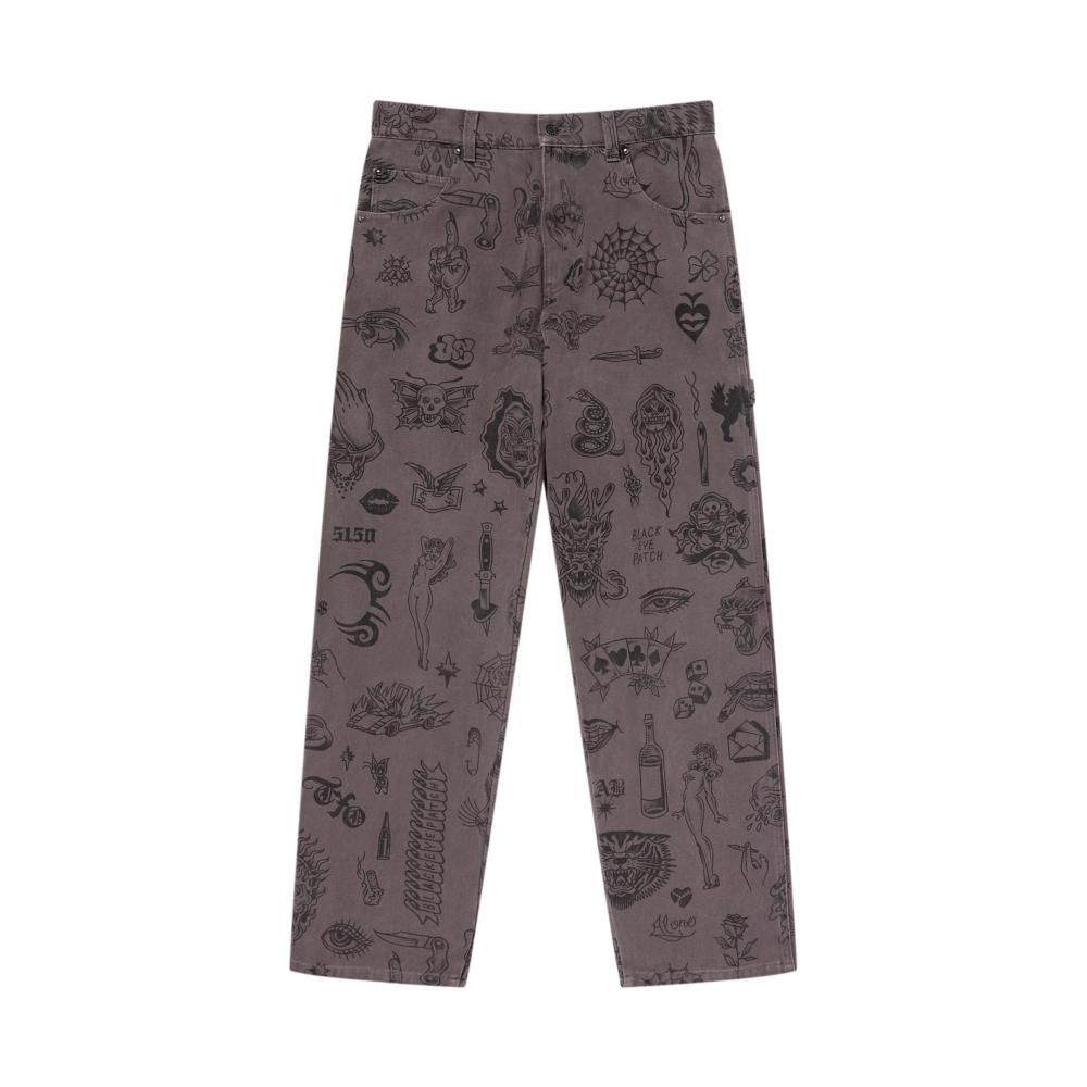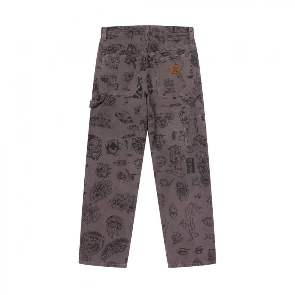 タトゥーアーティストの UE 氏のグラフィックがプリントされたダック生地ワークパンツ。