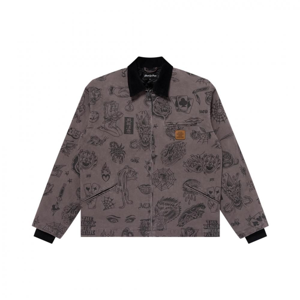 タトゥーアーティストの UE 氏のグラフィックがプリントされたダック生地ワークジャケット。